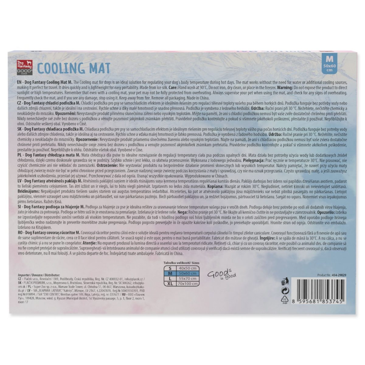 Hedvábná chladící podložka od Dog Fantasy – ideální způsob, jak se váš pejsek může v letních vysokých teplotách úžasně zchladit. Hledáte skvělý způsob, jak ochladit a zabavit svého psa během horkých letních dnů? Chladící podložka pro psy se samochladícím efektem je ideálním řešením pro regulaci tělesné teploty vašeho psa během horkých dnů. Podložka funguje bez potřeby vody nebo dalších zdrojů chlazení, takže je ideální i na cestování. Rychle schne a díky malé hmotnosti je snadno přenosná. Podložka je vyrobena z ledového hedvábí. Klíčové Vlastnosti: Samochladící efekt: Chladí automaticky bez potřeby vody nebo dalších zdrojů. Lehká a snadno přenosná: Ideální na cesty díky nízké hmotnosti a snadné skladovatelnosti. Snadná údržba: Rychleschnoucí materiál umožňuje jednoduché ruční praní. Specifikace Rozměry: 60 x 50 cm Materiál: Ledové hedvábí. Údržba: Ruční praní při 30 °C. Nežehlete, nečistěte chemicky a neukládejte do mrazáku. Nevystavujte produkt přímému slunečnímu záření nebo příliš vysokým teplotám. Použití Umístěte podložku na rovný povrch ve stínu nebo doma. Nechte mazlíčka pohodlně ulehnout – podložka začne chladit automaticky. V případě nutnosti po použití opláchněte ručně a nechte uschnout na vzduchu. Skladujte na suchém a chladném místě, mimo přímé sluneční záření. Upozornění Bezpečné použití: Udržujte daleko od ostrých předmětů a ohně. Nevystavujte produkt přímému slunečnímu záření nebo příliš vysokým teplotám ani neukládejte do mrazáku. Údržba: Jednoduché čištění a skladování na suchém místě prodlouží životnost produktu. Pravidelně podložku kontrolujte, a pokud si všimnete jakéhokoli poškození, přestaňte ji používat. Mějte na paměti, že ani s chladící podložkou nemusí být vaše zvíře dostatečně chráněno proti přehřátí. Nikdy nenechávejte své zvíře bez dozoru s podložkou a věnujte pozornost jakýmkoli známkám přehřátí. Odstraňte veškerý obal. Vyrobeno v Číně.