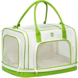 Má pevné, měkce polstrované dno s bezpečnostním páskem zakončeným karabinkou pro připnutí zvířete, čtyři velké síťované průzory a řadu možností otevírání na zip. Dno je dvojité: s praktickým úložným prostorem na příslušenství nebo krmivo. Taška je opatřena dvěma uchy a nastavitelným ramenním popruhem, který lze odepnout. Na zadní straně je návlekový pás, který umožňuje uchycení tašky na výsuvné madlo cestovního kufru. Hlavní přednosti: lehká a praktická úložný prostor na příslušenství nebo krmivo vnitřní pásek s karabinkou pro bezpečnou přepravu odnímatelný ramenní popruh s nastavitelnou délkou Rozměry: 47 × 30 × 28 cm Materiál: bavlna, len Barva: bílá, zelená
