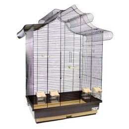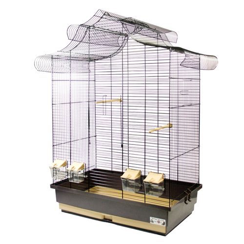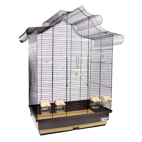 Klec pro exotické ptactvo s doplňky 4x bidlo a 4x krmítko. Klec má plastovou základnu hnědé a doplňky světle hnědé barvy, mřížka je svařována z kovového drátu černé barvy. Pro snadné čištění je klec vybavena vytahovatelným plastovým dnem světle hnědé barvy.