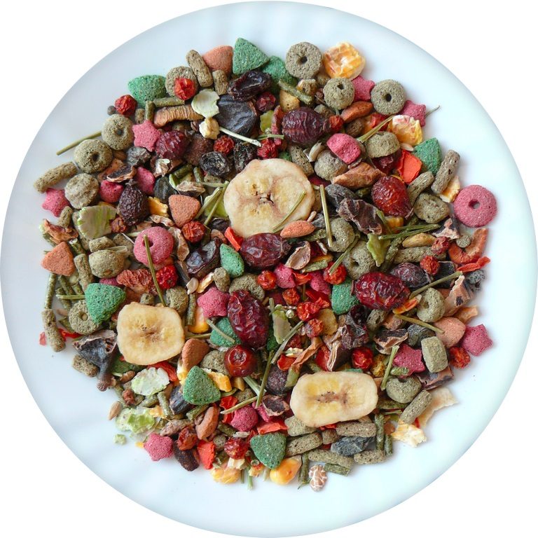 Složení: kukuřičné vločky, slunečnice bílá, vojtěška, extrudované obiloviny, svatojánský chléb, kukuřice, podzemnice loupaná, hrachové vločky, banány, rozinky, šípky, oves celý, čirok, kardi, pšenice, mrkev, dýně.
