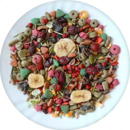 Kompletní krmivo pro činčily. Výběrová krmná směs pro činčily obohacená o spoustu ovoce, zeleniny a oříšků.