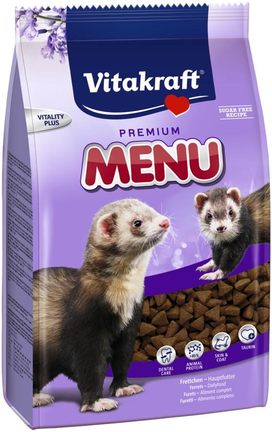 Kompletní krmivo pro fretky. Menu pro fretky je energeticky bohaté krmivo odpovídající zvláštním potřebám zvířat. Kromě látek důležitých pro výživu obsahuje také vitamíny a jiné rostlinné a živočišné složky.